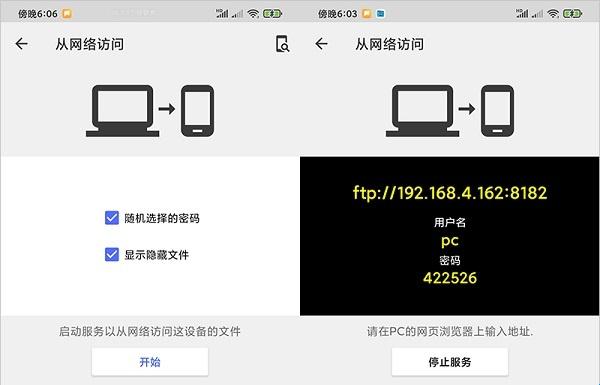 文件传送:在局域网内,你可以进行和电脑无线传送文件,默认会生成随机密码,如果你需要显示隐藏文件的话,也勾上,然后就会出现一个 FTP 地址和用户名密码。