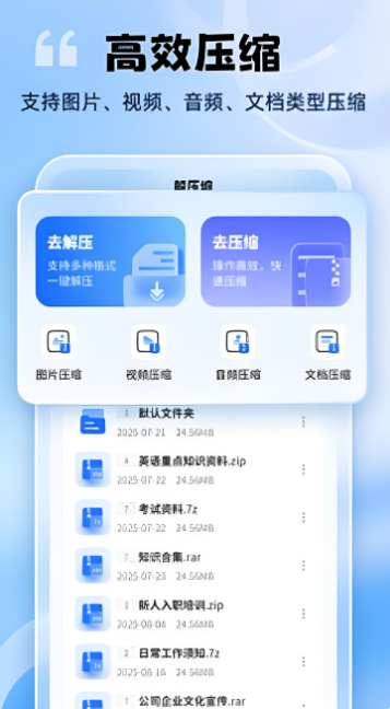 2、包含图片压缩、视频压缩、音频压缩、文档压缩等不同功能,还能快速解压文件;