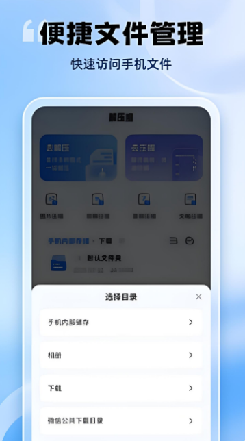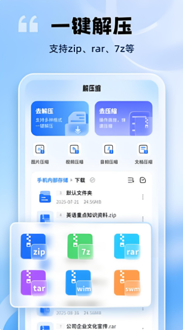 全能解压缩专家app是一款支持多格式文件管理的全能文件管理助手,支持分类管理手机中的各种文件,同时可以对文件进行压缩和解压缩处理,让大家在手机上也可以获得高效的文件解压缩体验,支持文件传输分享,能够快速进行不同平台传输分享,让用户可以轻松与好友分享文件,各类文件都可以预览,用户可以更加精准的找到自己需要的文件。