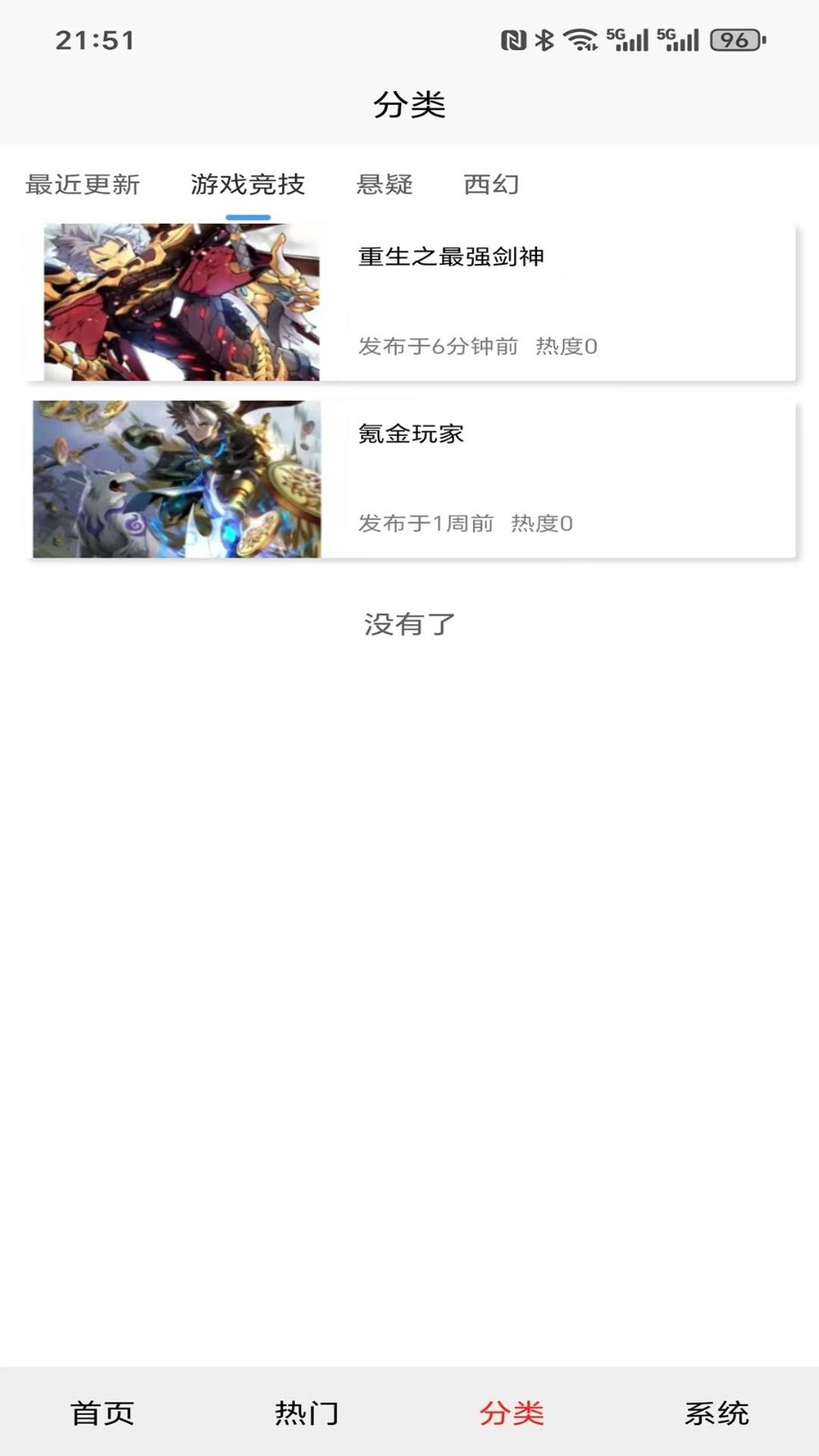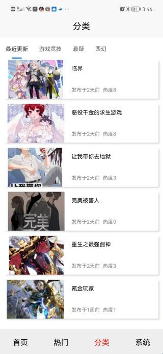 4、在分类中有最新更新、游戏竞技、悬疑以及西幻等不同的类别。