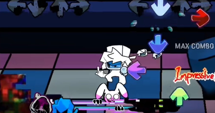 4、你需要不断随着节拍和音乐及时按下箭头,才能打败boss,下方是我们的游戏进度条,我们要让我们的进度条尽量的靠左。如果你喜欢挑战手速,并且喜欢不同的模组版本,那周五放克夜错误化模组整合版你一定要来试试。