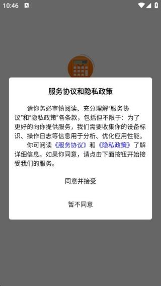 1、打开软件,阅读服务协议和隐私政策,点击同意并接受即可进入下一步。