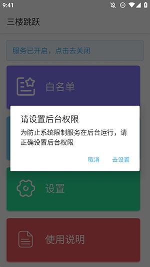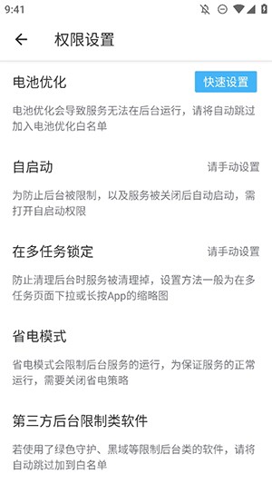 系统会限制后台服务的运行,为保证功能正常请授予以下权限: