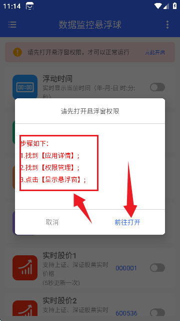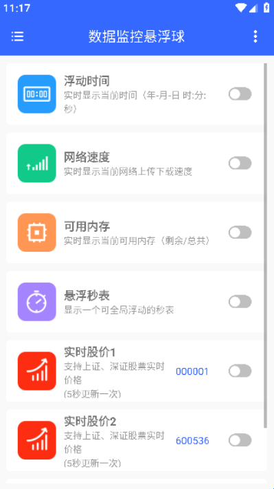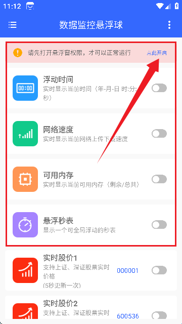 3、进入到软件首页中,如图所示。软件支持开启悬浮时间,网络速度,内存,秒表,实时股价等数据信息的悬浮展示,但是首先需要授予软件悬浮窗权限,