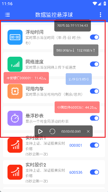 数据监控悬浮球App是功能强大的实时数据监控工具,App界面干净简洁、功能丰富强大,首页实时查看多种常用数据,包括浮动时间、网络速度、可用内存、悬浮秒表等,大家可随时在线获取当前精确时间,全屏时钟显示非常方便,快点下载吧!