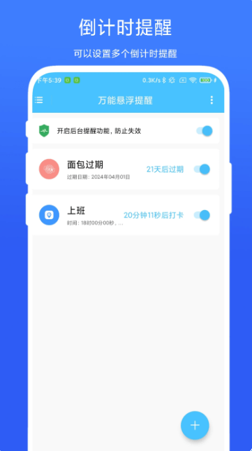 万能悬浮提醒App是支持以悬浮窗形式实现提醒的软件,App支持日程管理、生活提醒、倒计时、上下班打卡等功能,大家可在这里设置多个倒计时提醒,还可以设置多种不同的提醒方式,辅助生活、学习和工作,每件事都管理的井井有条,快点下载吧!