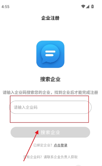 2、输入企业码,定位企业,就可以完成注册