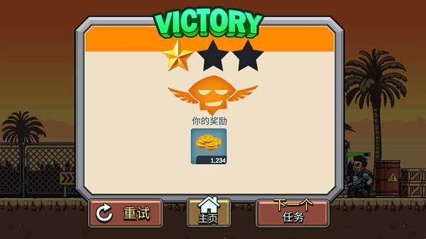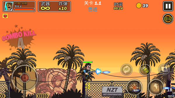 玩家操控特种兵在2D横版战场中移动,通过虚拟摇杆控制前后左右移动,点击射击按钮消灭迎面而来的敌人,过程中需灵活走位躲避敌方攻击。