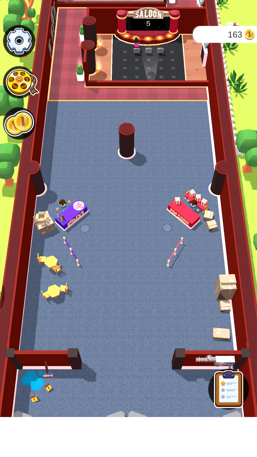 游戏的玩法也很简单,通过购买电影播放权,然后出售门票、零食等赚取金币,扩大规模后可以需要雇佣员工,还要应对各种突发因素,这样一款有趣的经营游戏你还在等什么呢,快来体验吧。