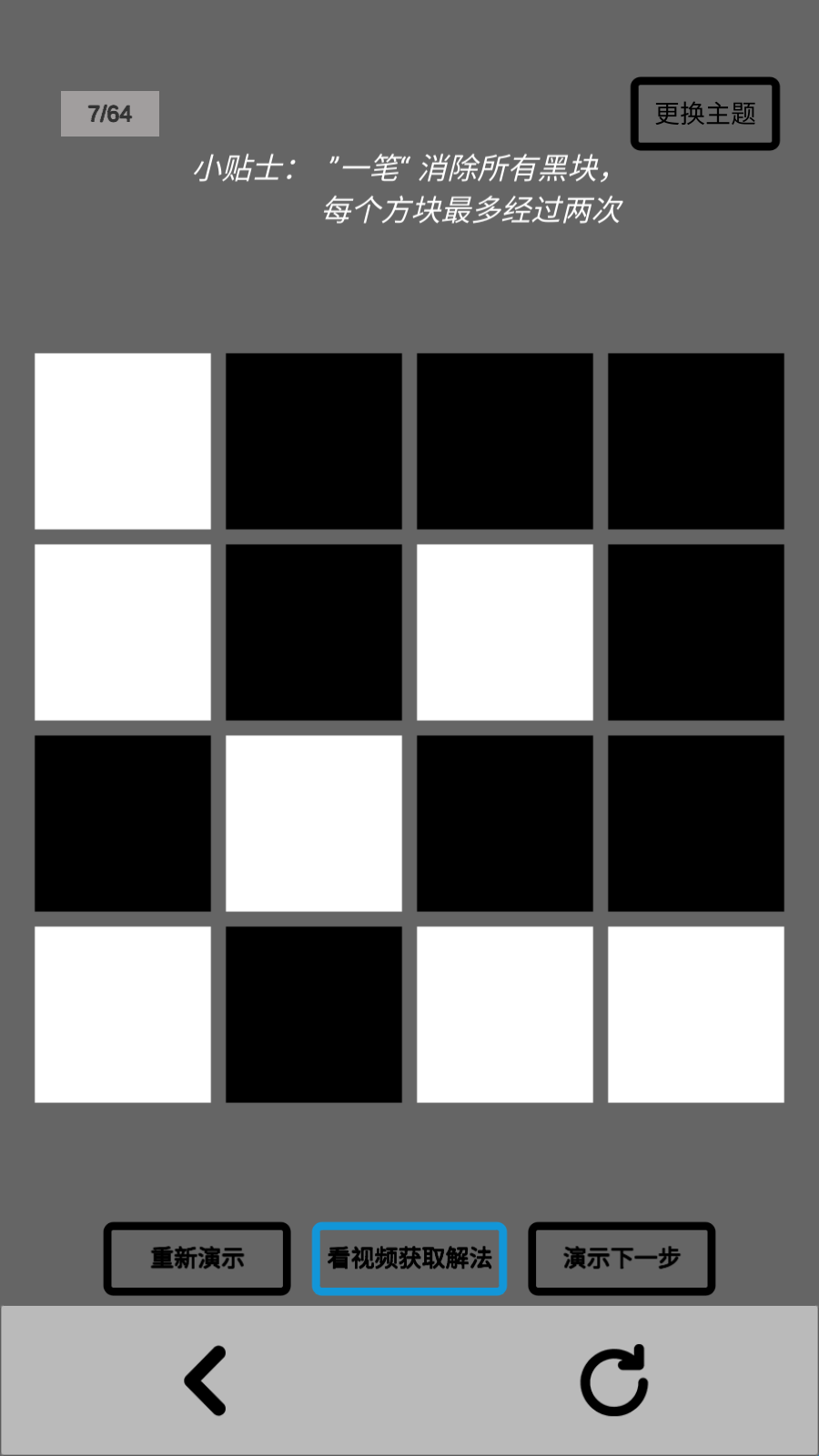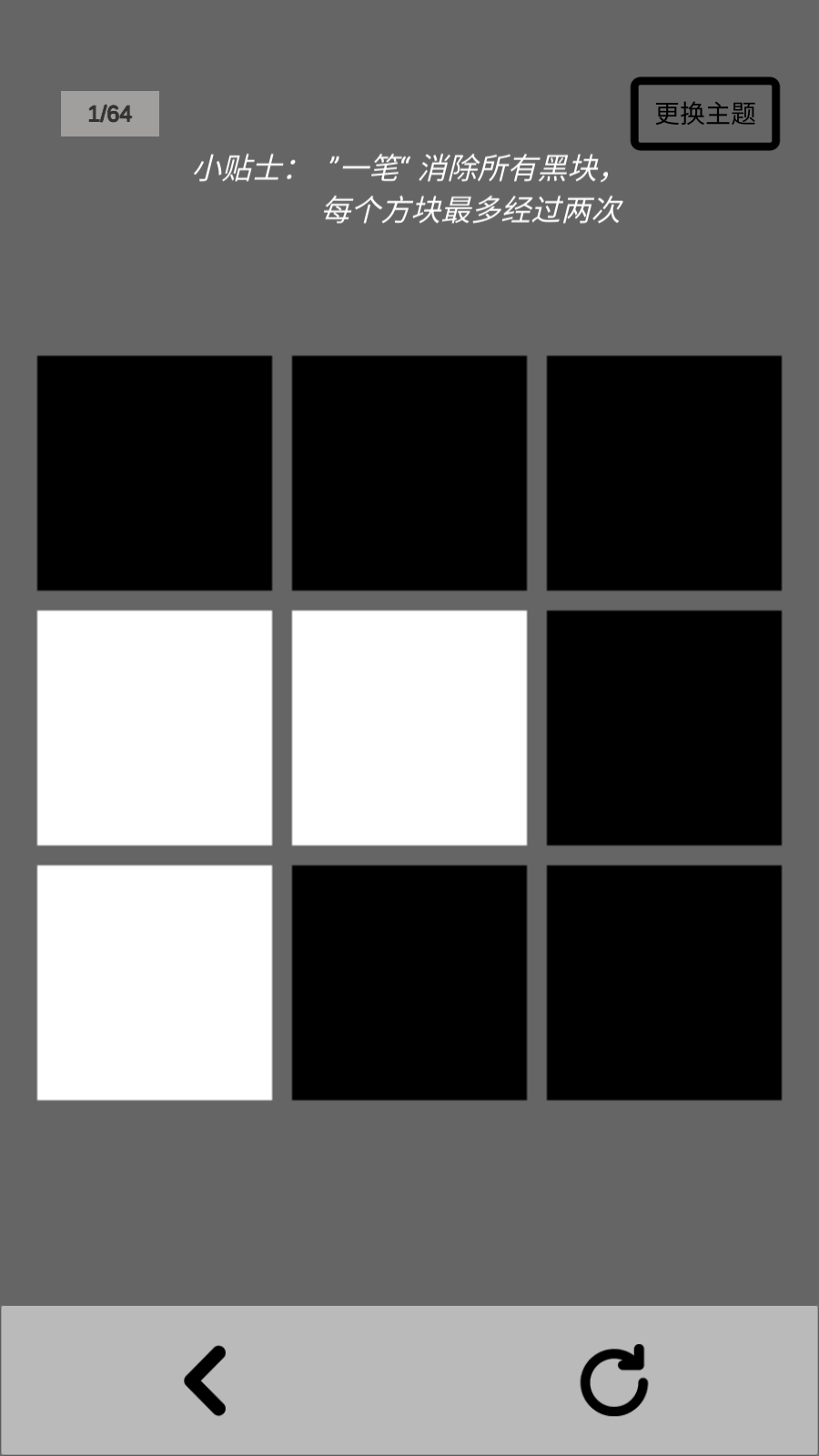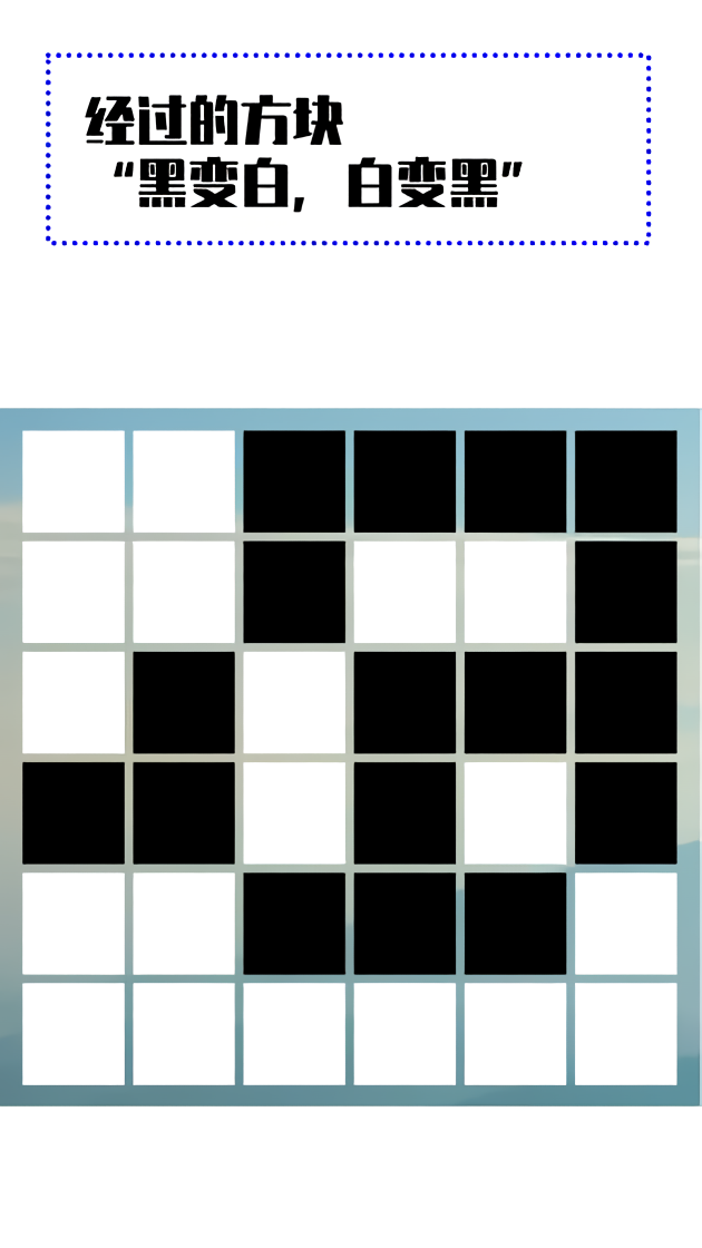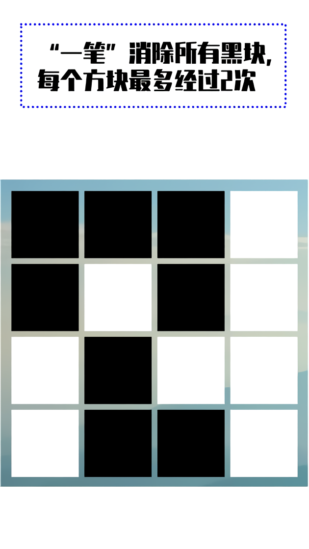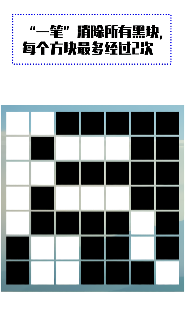 1、在黑白方格中尝试利用一笔消除掉所有的黑块即为闯关成功,每一个方块最多经过两次,简约直白的规则。