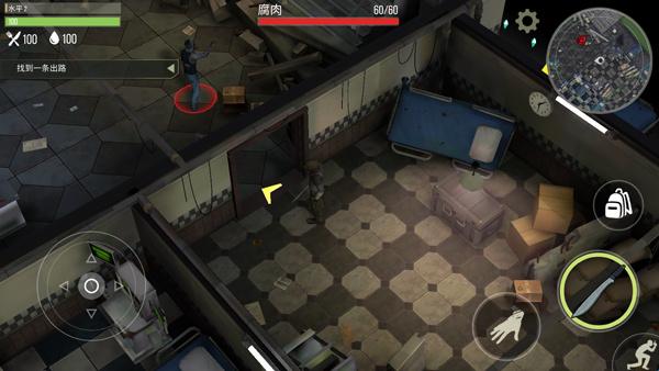 2、在屏幕的右上角是你所在区域的雷达地图,你可以通过这个雷达地图来观察你周围是否存在有用的物资和有没有僵尸。如果出现僵尸的话在地图中会出现移动的红色标志。