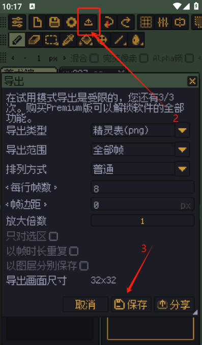 3、保存完成后再点击上方框出图标,自定义导出类型、帧率、排列方式、边距等导出作品即可