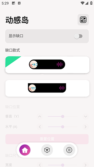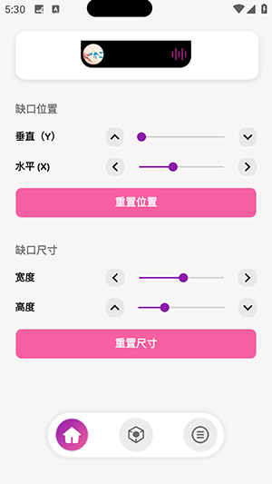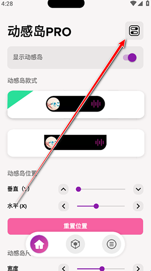 5、回到主页面往上滑,左右调节滑杆来控制动感岛位置和动感岛尺寸,最后点击重置位置或者重置尺寸即可。