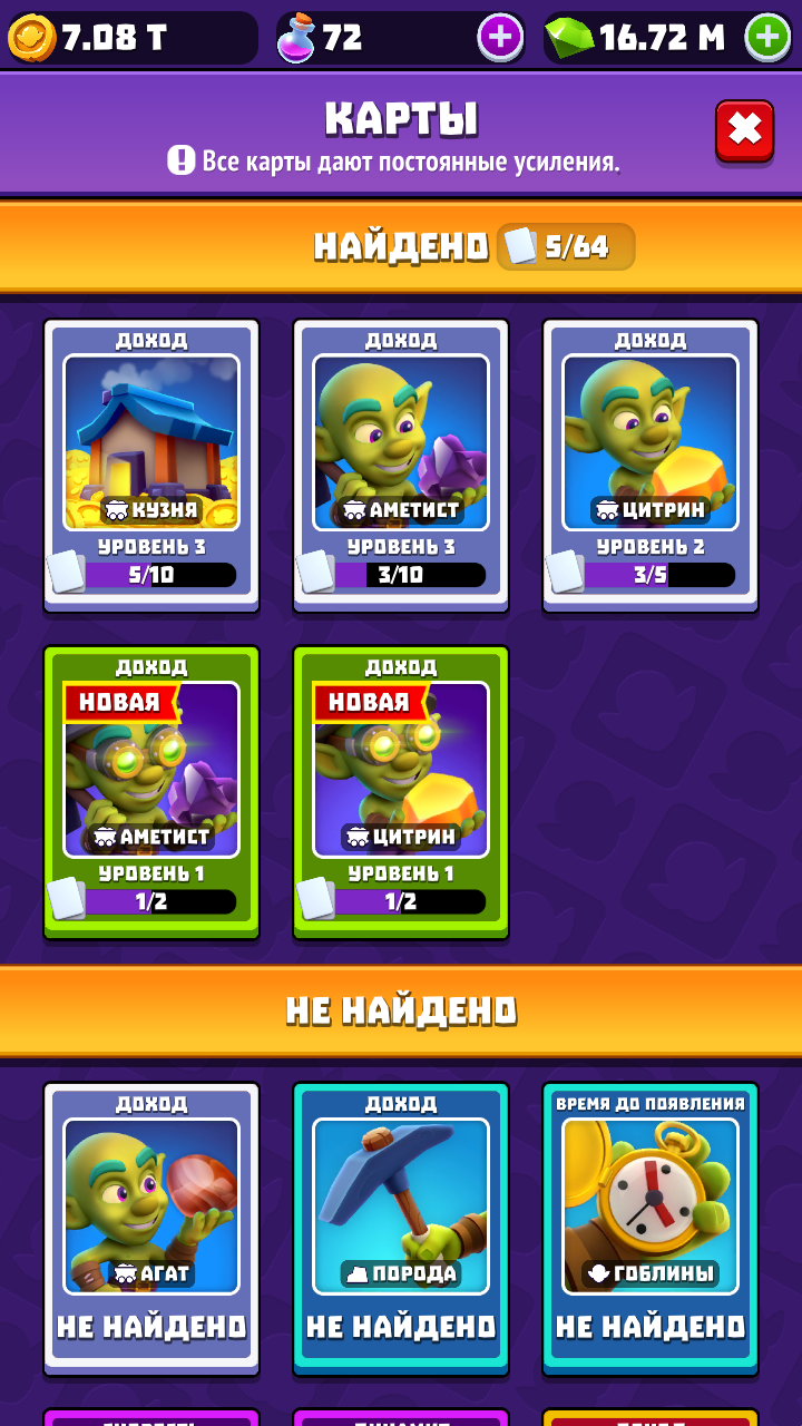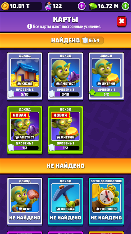 4、收集各种卡牌升级材料升级卡牌,从而增加黄金收入并获得更加强力的哥布林。