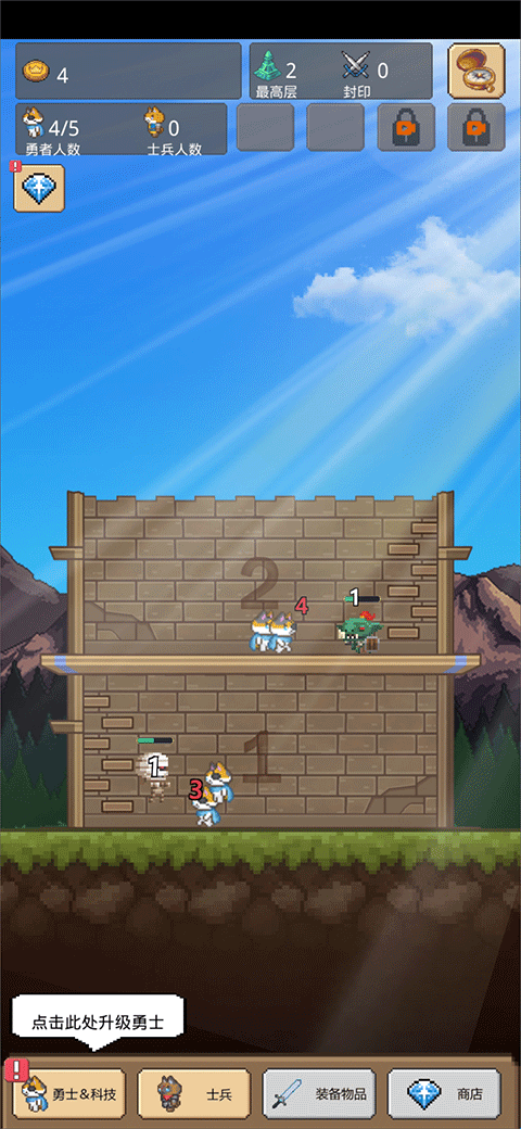 1、进入游戏后,玩家点击楼层即可召唤出勇者和士兵去打倒妖怪。