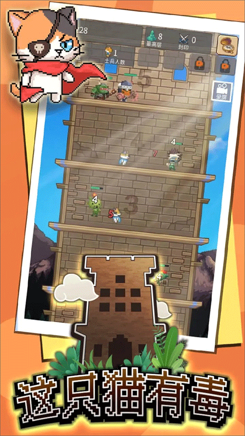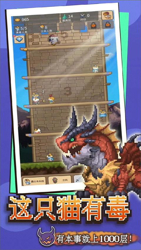 这只猫有毒官方版还提供了多种多样的装备道具和科技研发,这些装备效果各异,但拥有的都是提高攻击力,召唤强力勇者等等提供优势的效果,随着玩家往上推进层数,这些加成的效果也会随之变强,让勇士和士兵们杀敌更加容易,喜欢休闲挂机和爬塔养成游戏的玩家可不容错过。