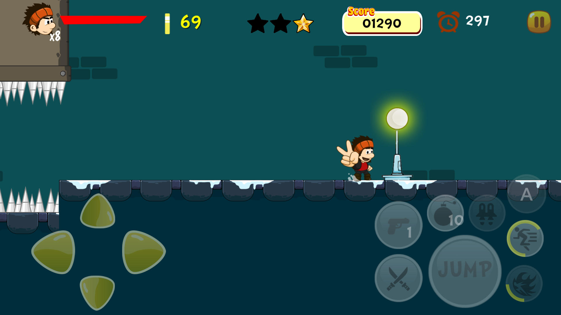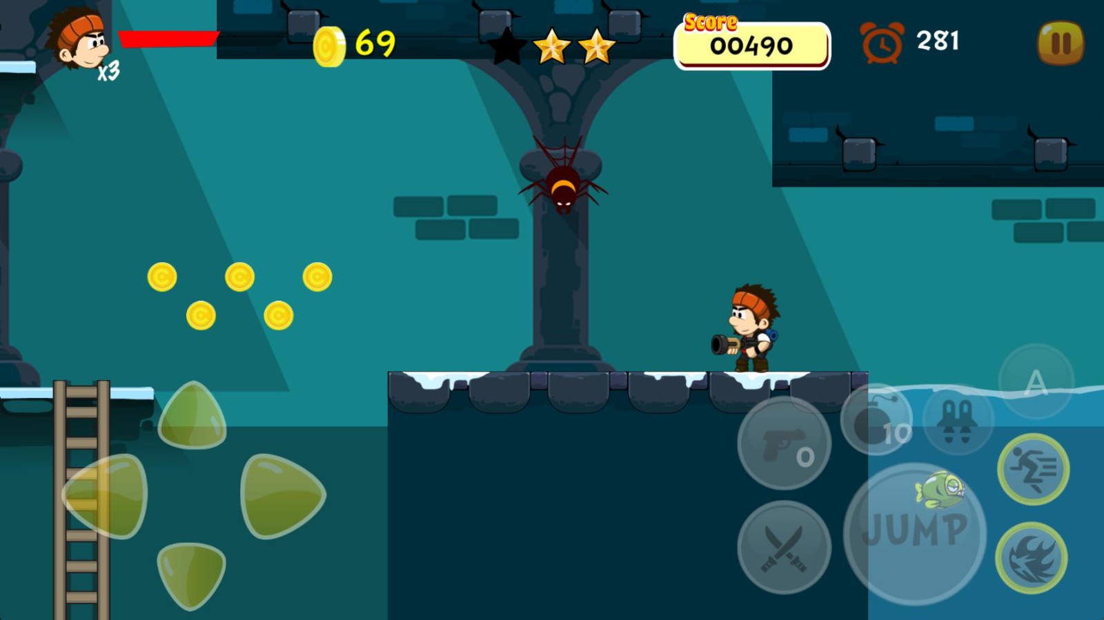 3、玩家操纵主角通过危险的地形和障碍物跳跃,攻击和躲避敌人。