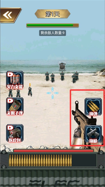 点击武器栏图标可切换不同枪械类型,当弹药耗尽时,需要手动点击装填按钮来补充弹匣。