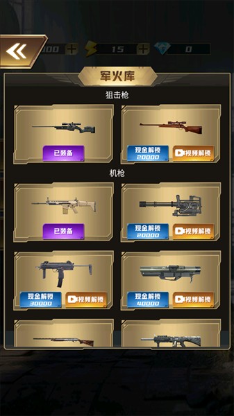 3、我们还可以通过军火功能来购买狙击枪、机枪等多种不同的武器枪支进行使用。