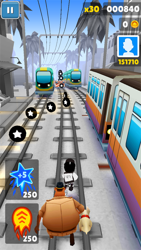 4、随机应变沉着应对,学会默数滑板的消失时间,以及优化跑酷路线(何时放开的捡道具、游戏币,何时选择安全路线为主)不要顾此失彼。