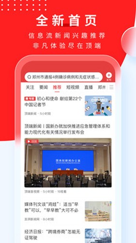 6设置有各种频道,包括郑州、时政、经济、短视频、直播等,能够随时切换查看。